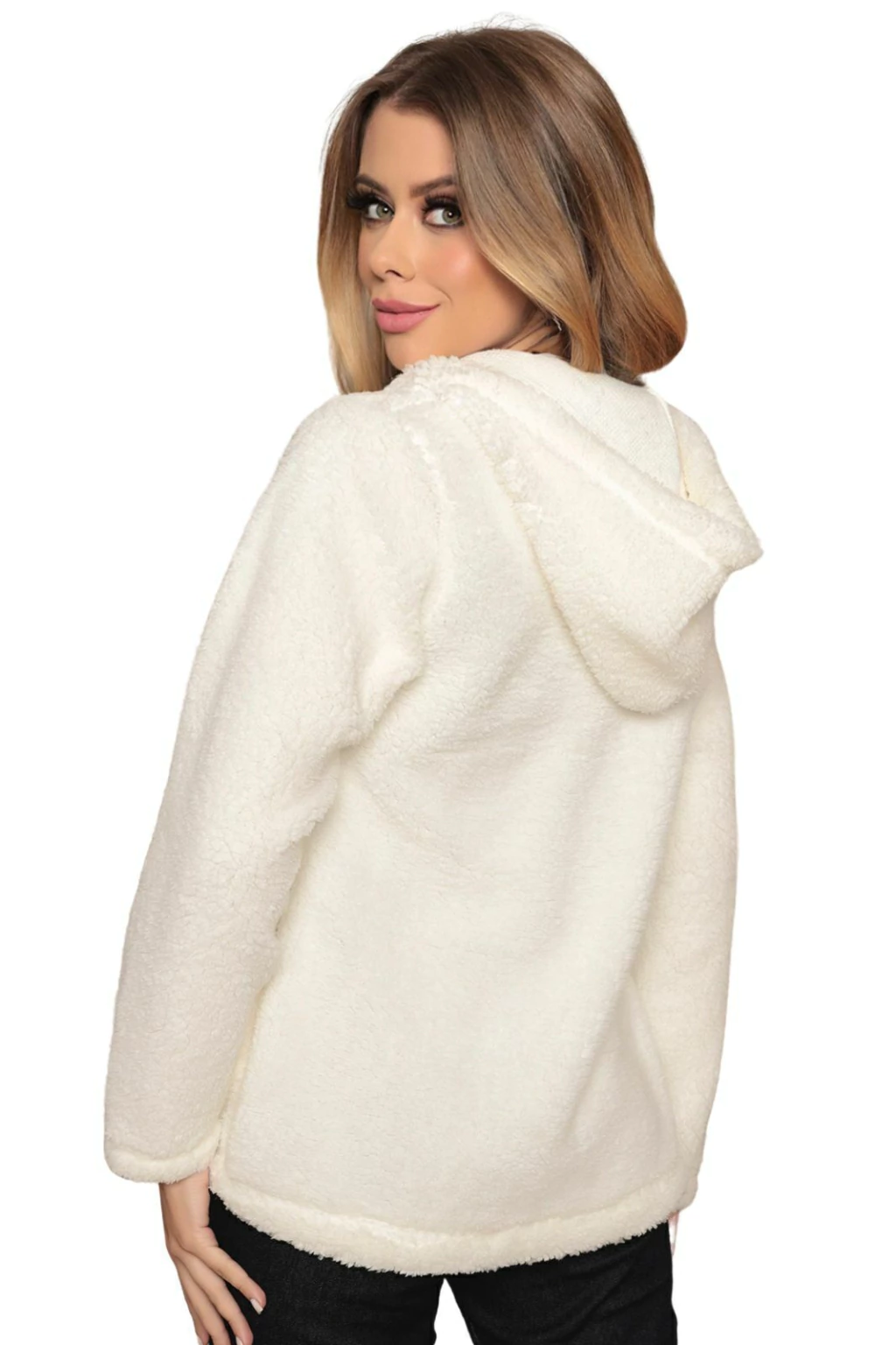 Tecido Plush de Alta Qualidade: Feito com um material teddy macio, o casaco proporciona uma sensação única de conforto, envolvendo você em uma textura irresistível. Mantenha-se aquecida e na moda durante os dias mais frios.