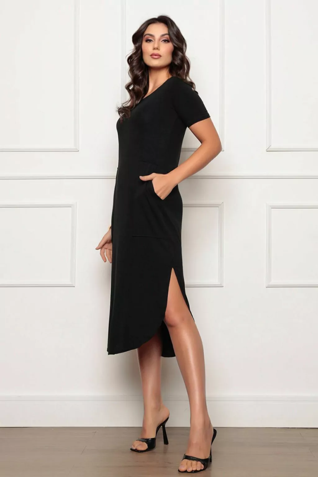 Este vestido midi é mais do que uma simples peça de roupa; é um convite para a mulher moderna que busca um equilíbrio perfeito entre conforto e estilo durante a estação mais quente do ano. Com sua gola canoa elegante, mangas curtas e uma fenda lateral, este vestido é mais do que moda - é uma declaração de confiança e elegância.